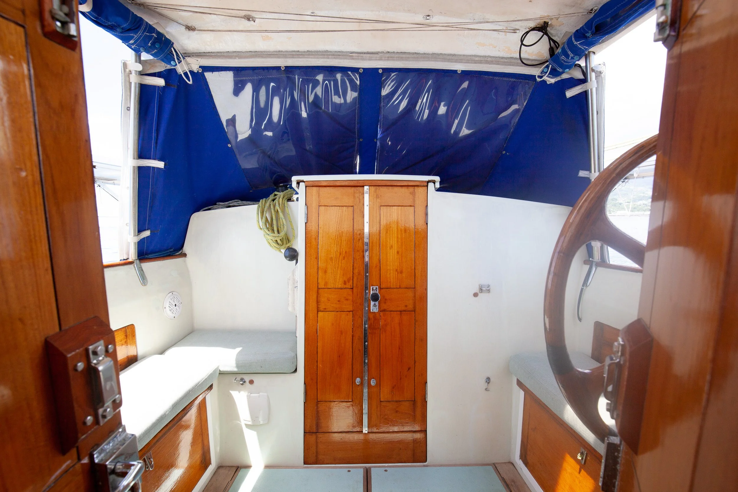Her graceful lines and brightwork always turn heads in the bay. The very protected cockpit with panoramic toughened-glass windscreen, with only two steps down into the cabins, creates a very liveable and safe space in which to keep your head in foul weather. The low-down weight of the tanks in the long keel make for a sea-kindly motion with excellent tracking in ocean swells. A foldable helm seat allows for extended hand-steering from the cockpit, whilst the Hydrovane makes energy-free accurate steering on passage a breeze, and offers an emergency rudder.
